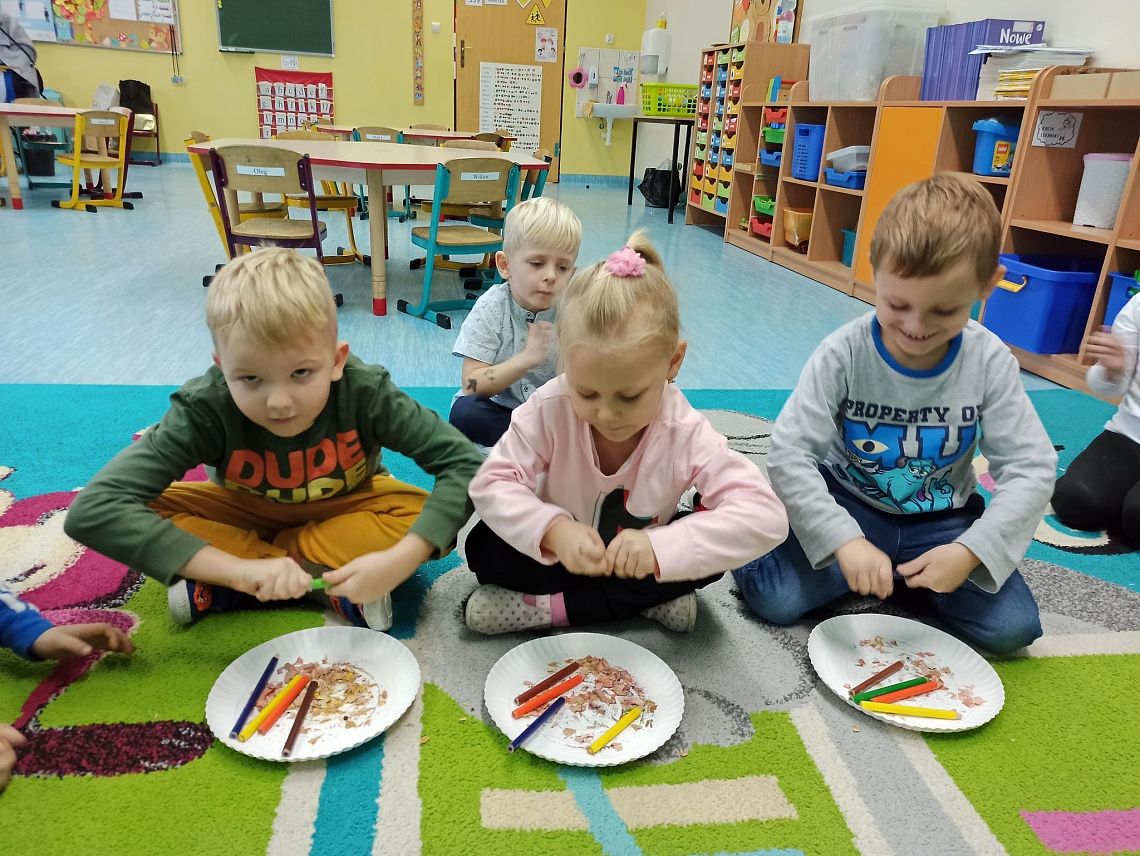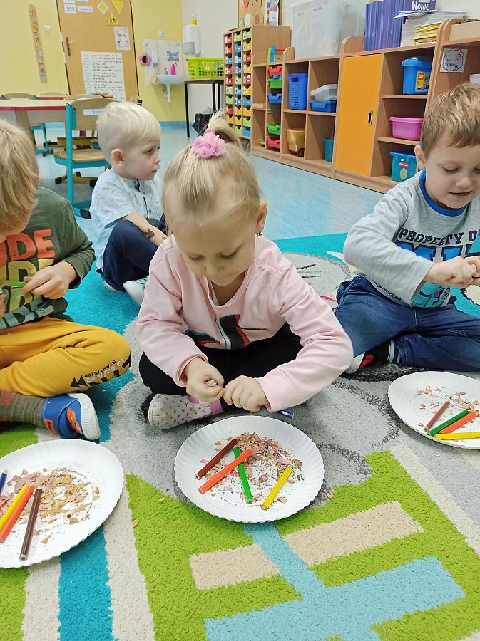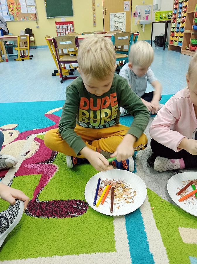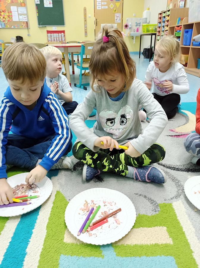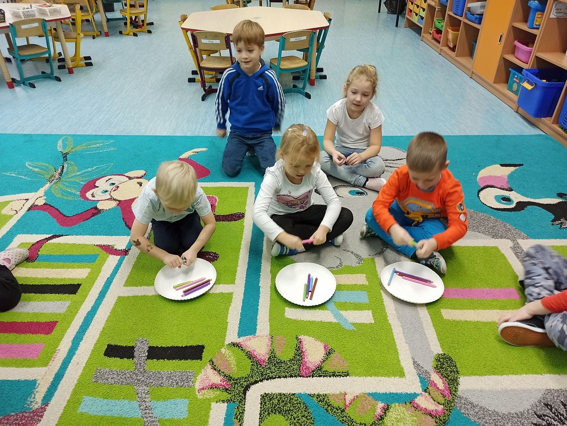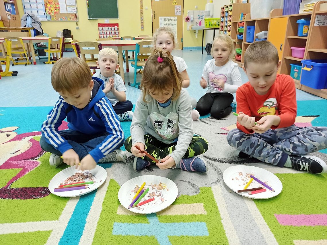 23 listopada starszaki z grupy 0 C zamieniły szary, listopadowy dzień w kolorowy. Tego dnia świętowały Dzień Kredki. Celem zabaw było zapoznanie i utrwalenie kolorów, integracja grupy, kształcenie sprawności manualnych, doskonalenie umiejętności liczenia oraz reakcji na sygnał dźwiękowy. Dzieci segregowały kredki kolorami, przeliczały, układały z nich figury geometryczne, ozdabiały ogromne kredki. Wzięły udział w zawodach w ostrzeniu kredek na czas. Tego dnia było kolorowo, wesoło i tęczowo.