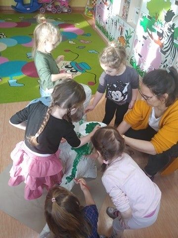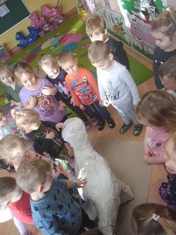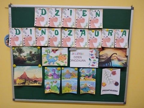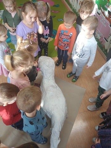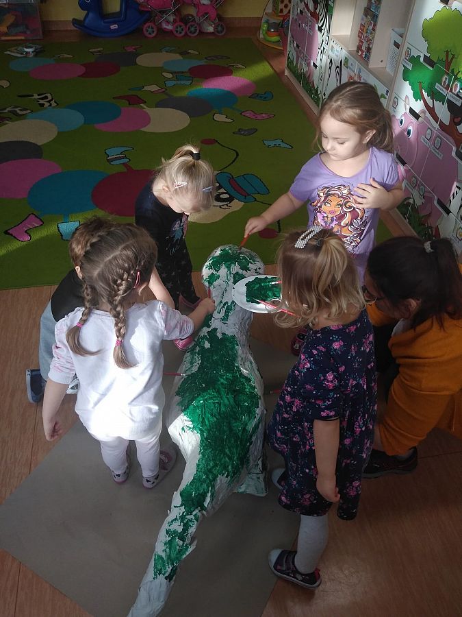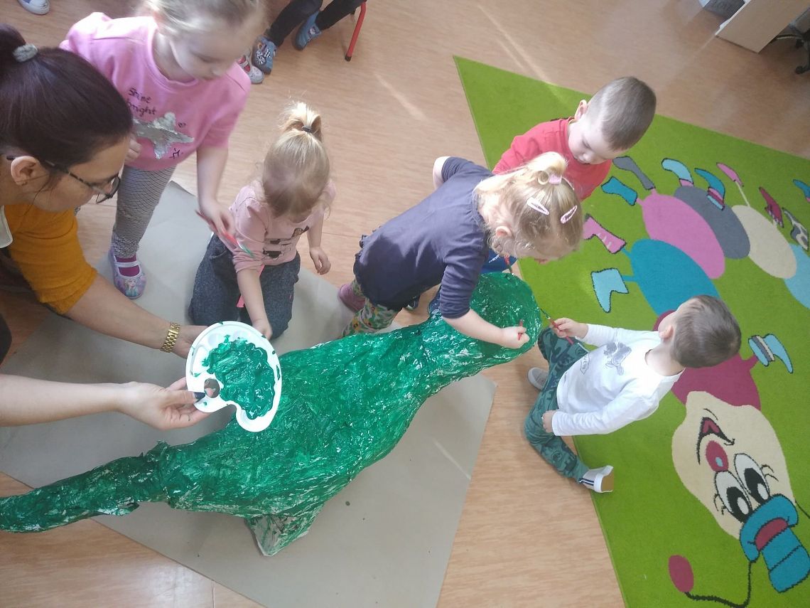 Zrobiliśmy prace plastyczne oraz pomalowaliśmy dużego dinozaura.
