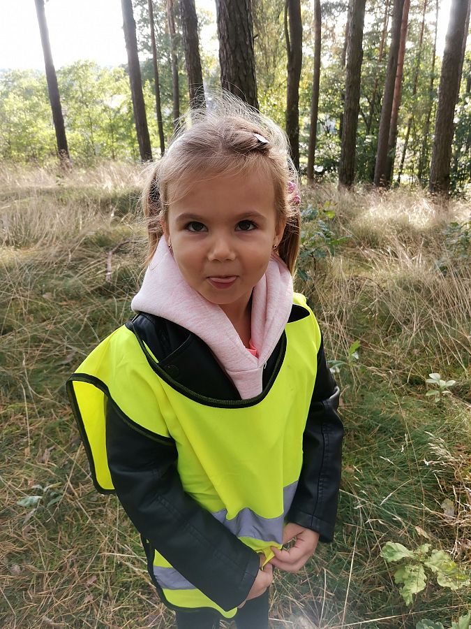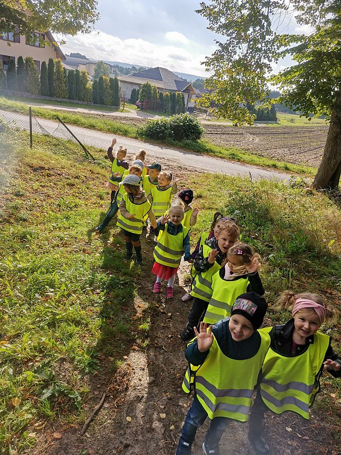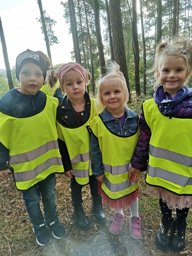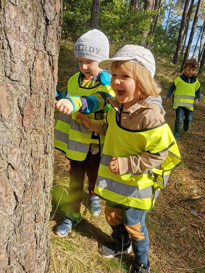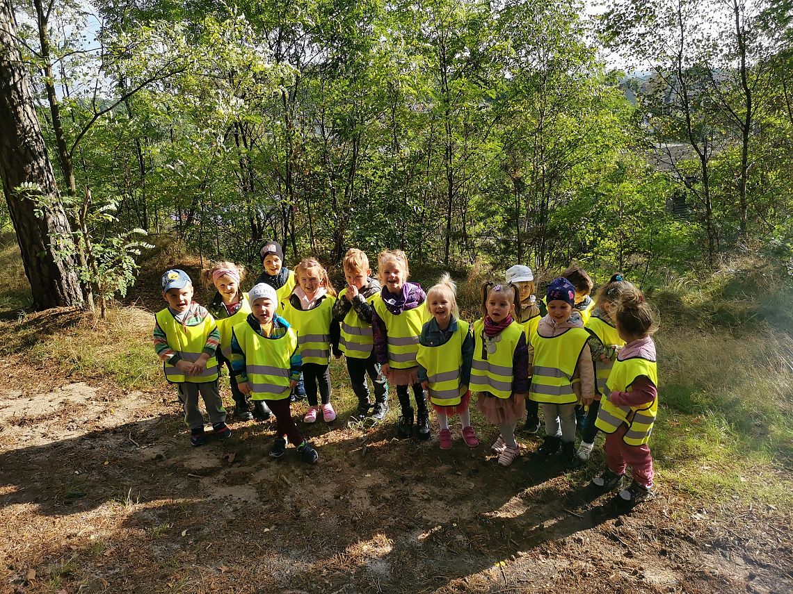 Korzystając ze słonecznej pogody wybraliśmy się na pierwszy jesienny spacer do lasu. Zadaniem dzieci była obserwacja drzew w jesiennej szacie, zwrócenie uwagi na kolory i kształty liści. Dzieci słuchały odgłosów lasu, a do kącików przyrodniczych zbierały „skarby”, które pani Jesień zostawiła w lesie. Głównie były to szyszki i żołędzie.