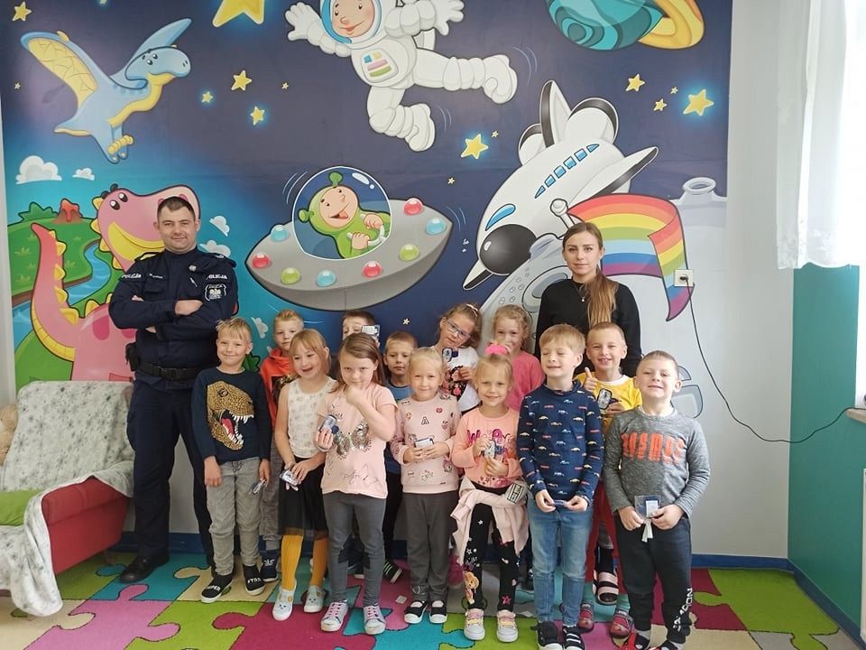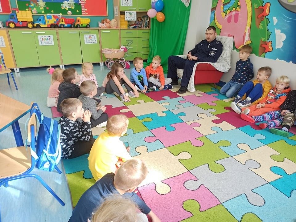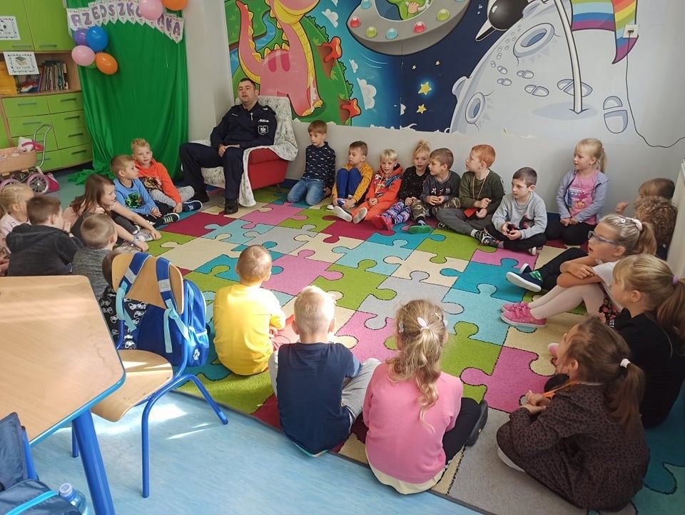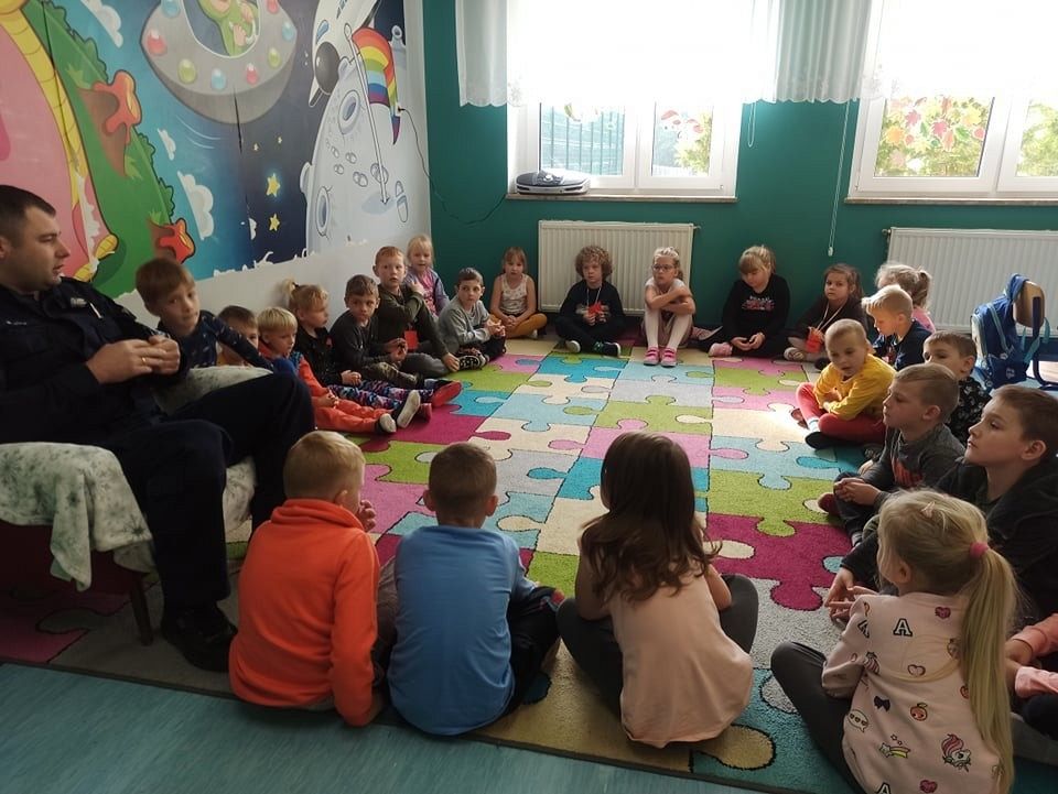 22go września zerówki w ramach tygodnia o bezpieczeństwie spotkały się z Policjantem, Starszym Sierżantem Panem Mariuszem. Przeprowadził on pogadankę i bezpieczeństwie oraz przybliżył specyfikę pracy policjanta. Rozmawialiśmy na temat konieczności przestrzegania ruchu drogowego, zachowania się na przejściach dla pieszych, zasad bezpiecznego przechodzenia przez drogę oraz przybliżył na czym polega praca policjanta.