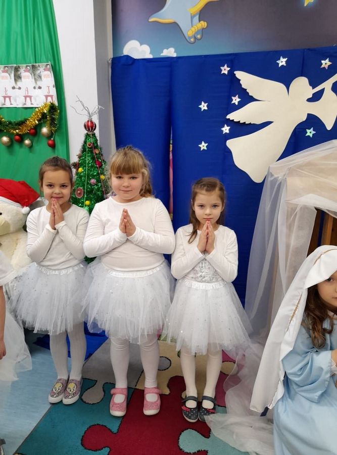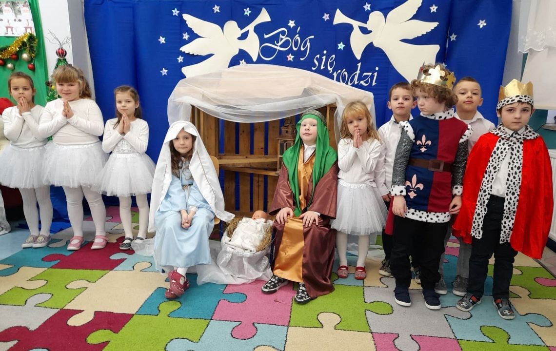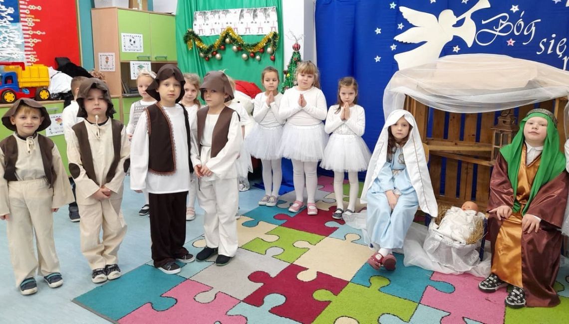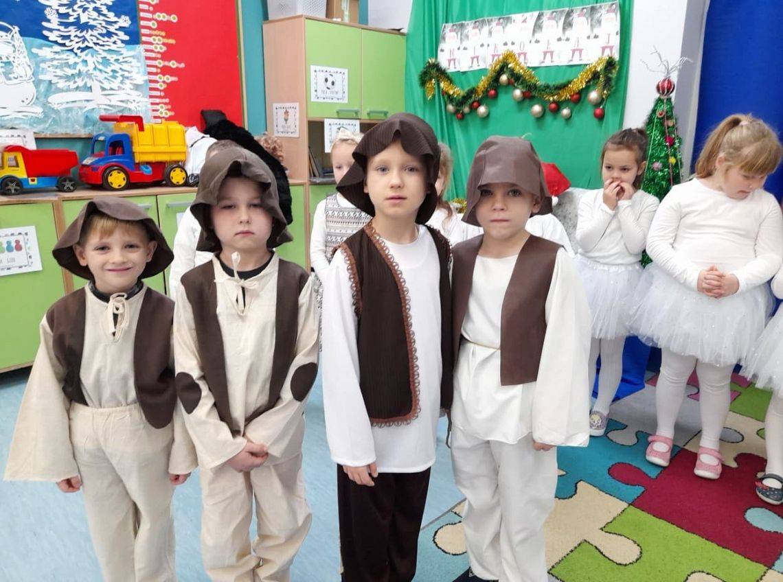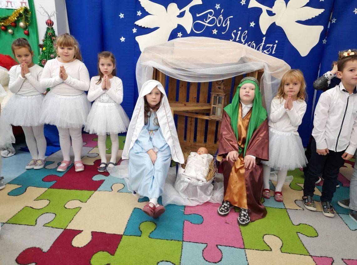 Tuż przed świętami dzieci z Grupy 0B przygotowały dla rodziców i młodszych kolegów z przedszkola przedstawienie jasełkowe. Mimo ,że za oknem śnieg i zimno w sali zapanowała ciepła, świąteczna atmosfera. Było niezwykle miło i rodzinnie. Gościliśmy koleżanki, kolegów, panią dyrektor i nauczycieli z innych grup. Oprócz przedstawienia dziewczynki zaprezentowały taniec śnieżynek do muzyki P. Czajkowskiego. Dzień zakończyliśmy wigilijnym spotkaniem , życzeniami i słodkim poczęstunkiem.