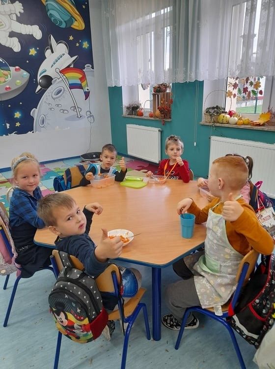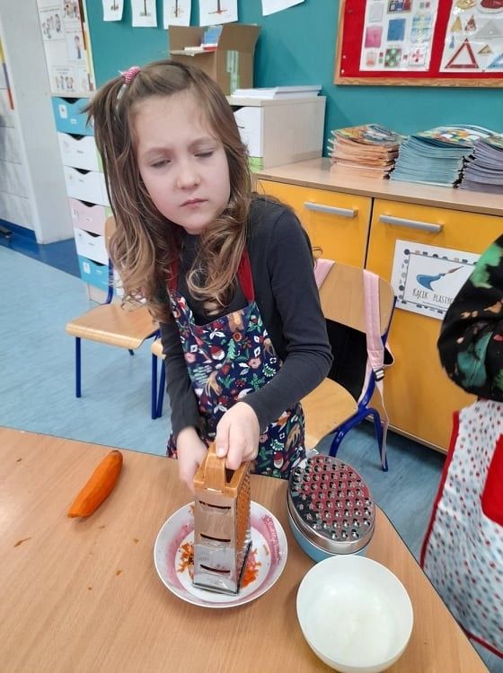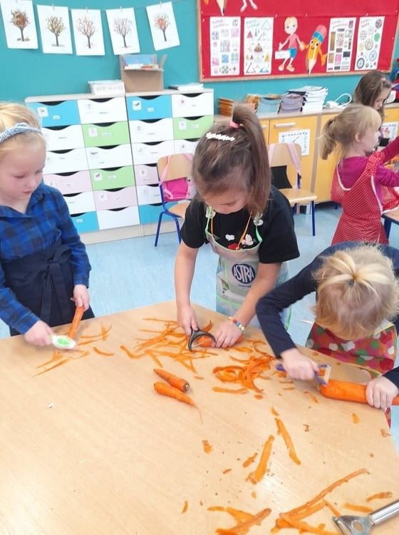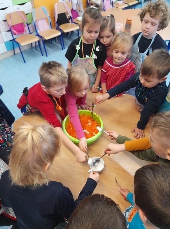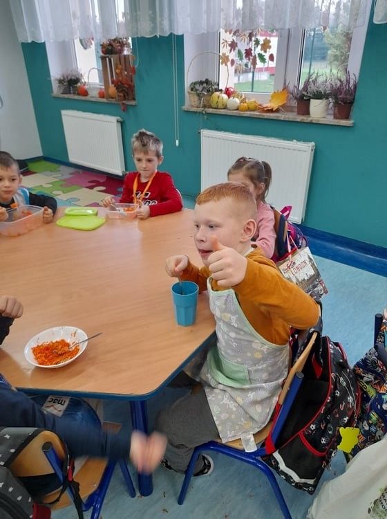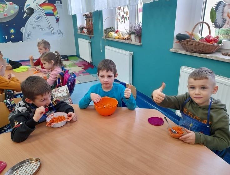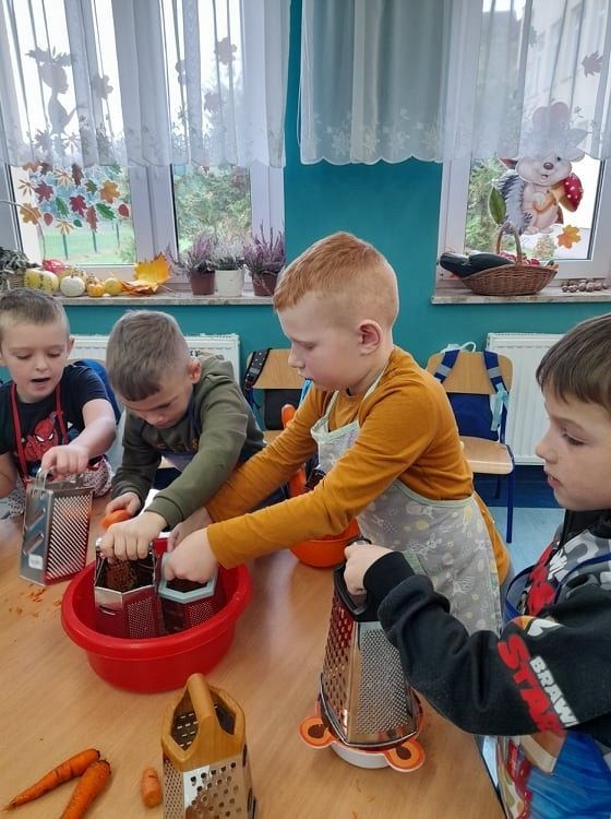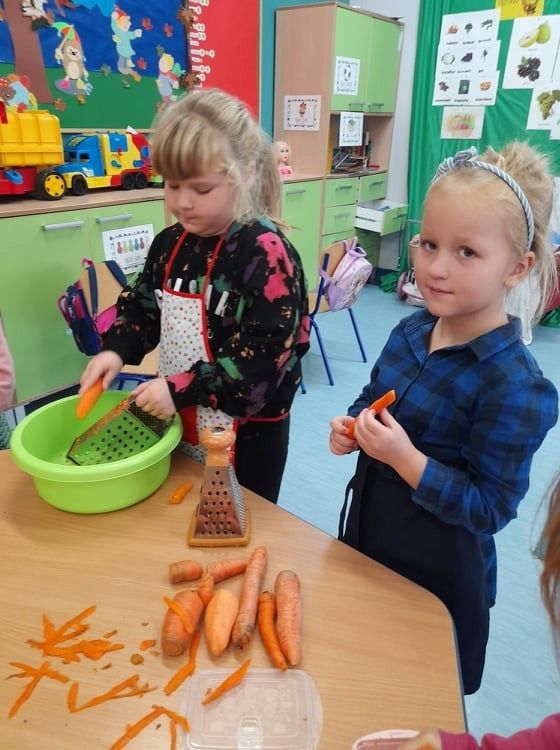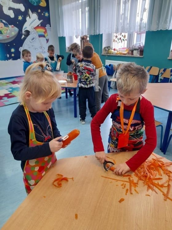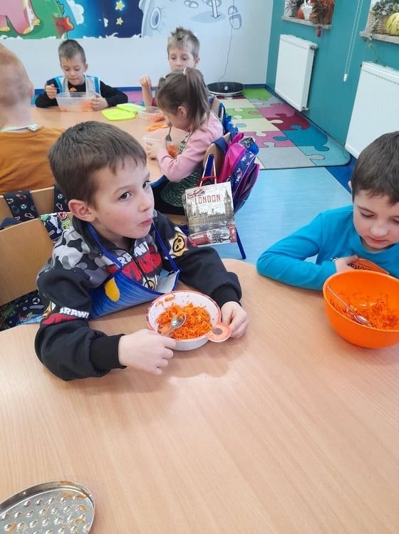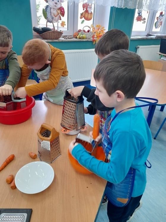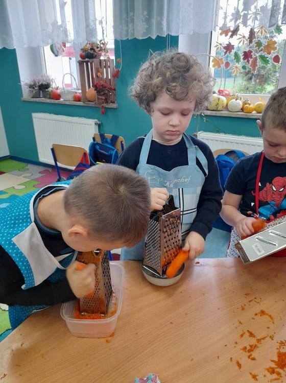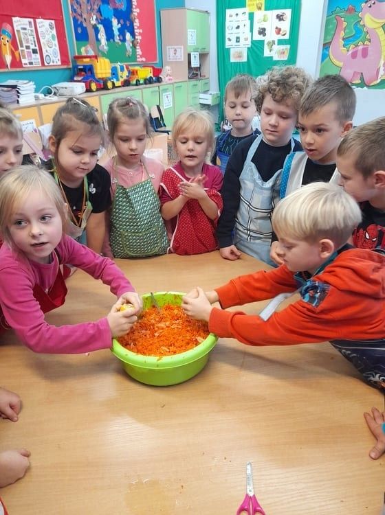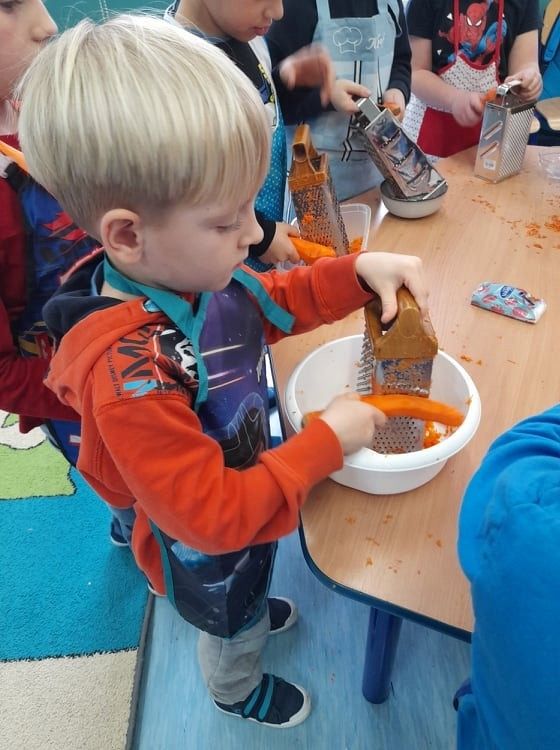 W tym tygodniu sześciolatki z grupy 0B rozmawiają o zdrowiu. Skoro jest jesień i ma być zdrowo, oczywiście dzieciaki przygotowywały surówkę z marchewki i jabłka. Nasza sala zamieniła się w kuchnię małych master szefów . Było sporo pracy i bałaganu ...ale surówka wyszła pyszna!!! Potwierdzili to nawet rodzice, bo każdy mógł zabrać swoje kulinarne dzieło do domu i poczęstować bliskich. Przed nami jeszcze kilka kulinarnych pokazów ... ale to niespodzianka .