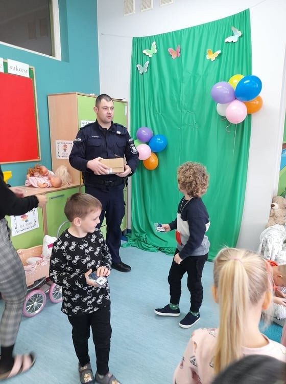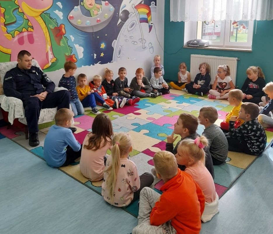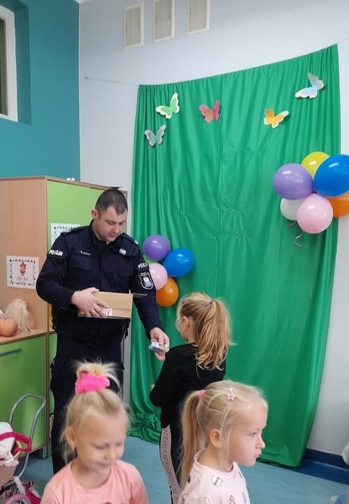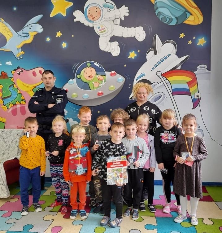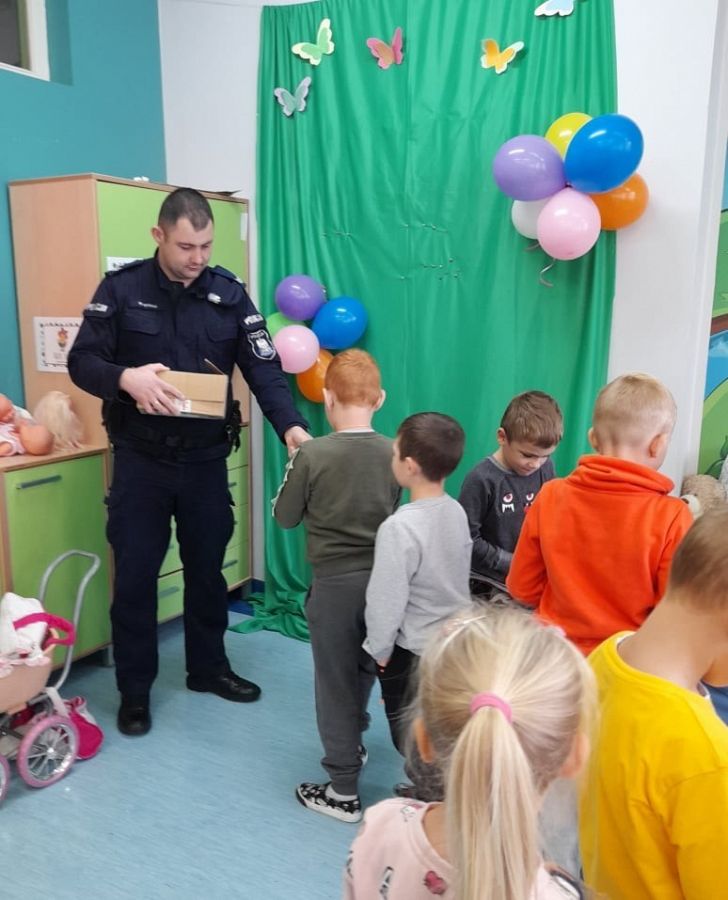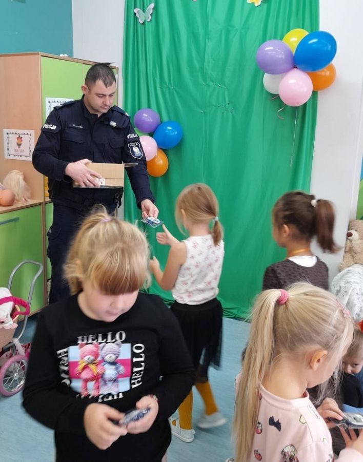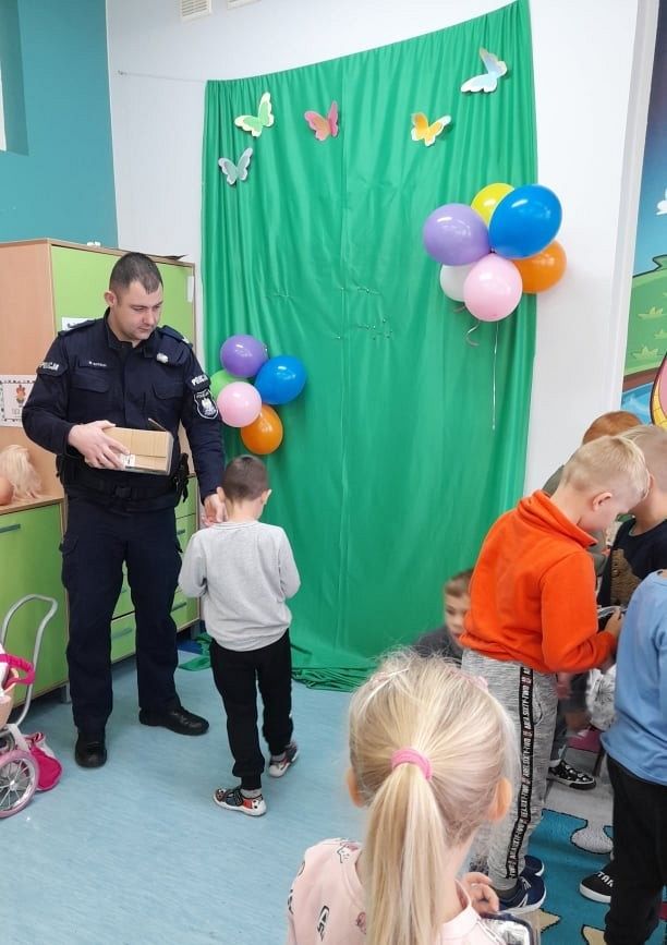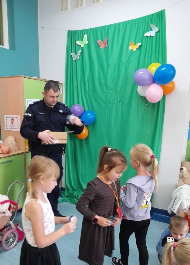 Dzisiaj milusińskich z grupy 0B odwiedził przyjaciel dzieci, dzielnicowy, starszy sierżant Mariusz Wycech z Łęczyc. Pan policjant opowiadał dzieciom o bezpiecznym poruszaniu się po drodze. Maluchy z ciekawością słuchały i aktywnie brały udział w spotkaniu. Na zakończenie wszyscy otrzymali świecące bransoletki , które na pewno przydadzą się dzieciom podczas jesiennych spacerów, gdy dzień jest krótki i wcześnie robi się ciemno. Dziękujemy za zorganizowanie tego miłego i pouczającego spotkania .