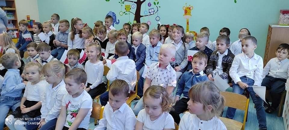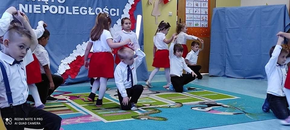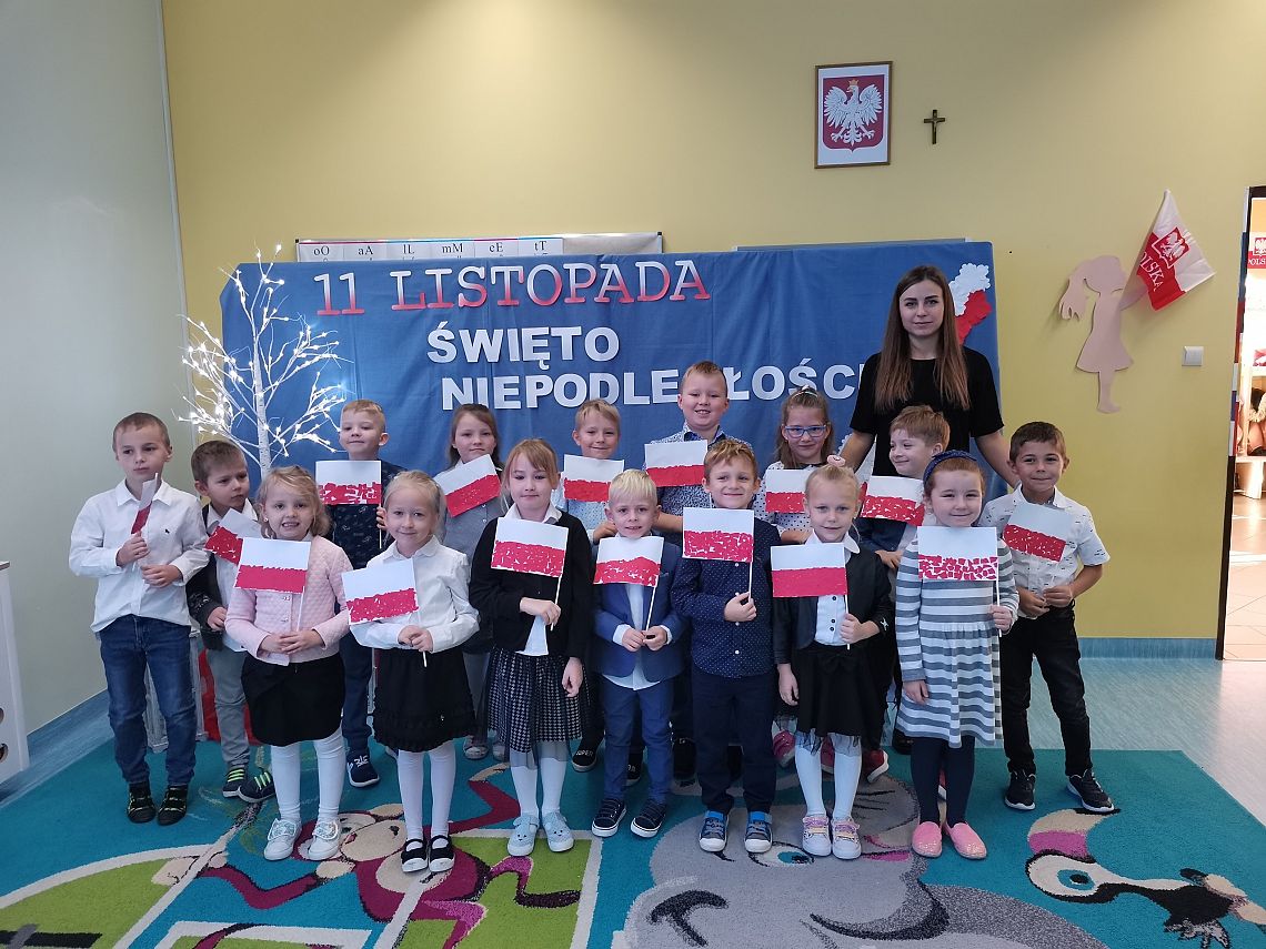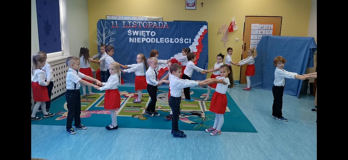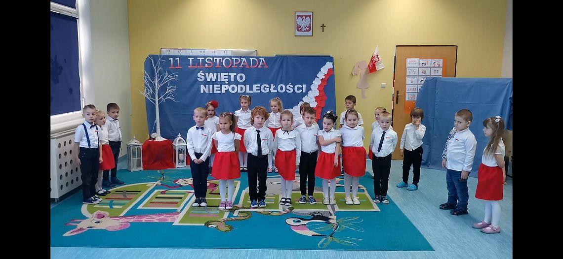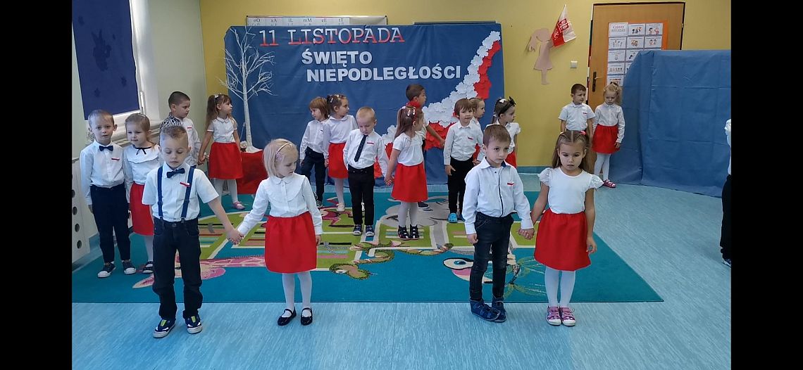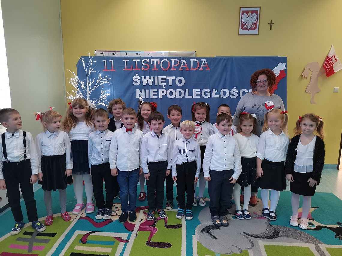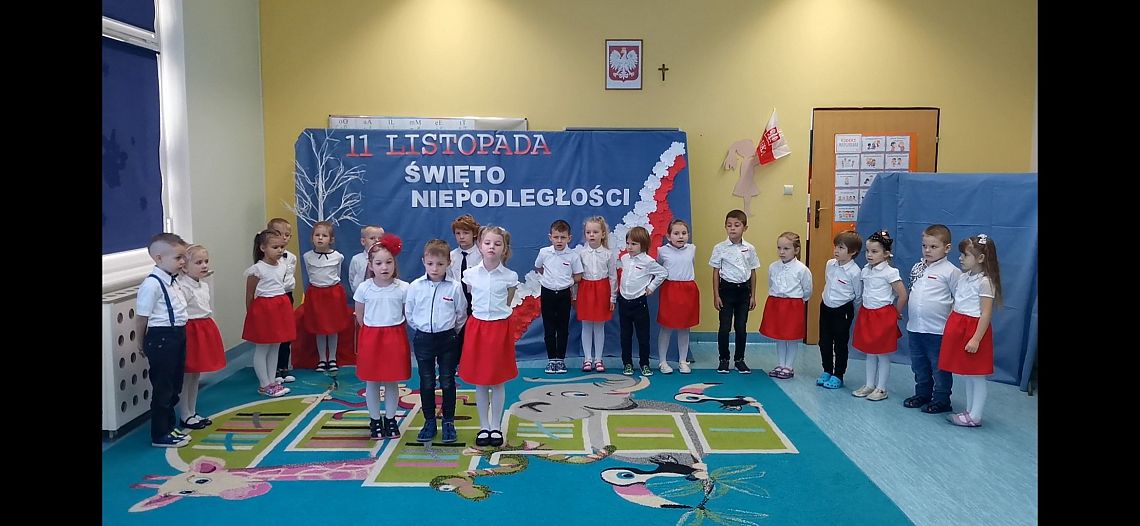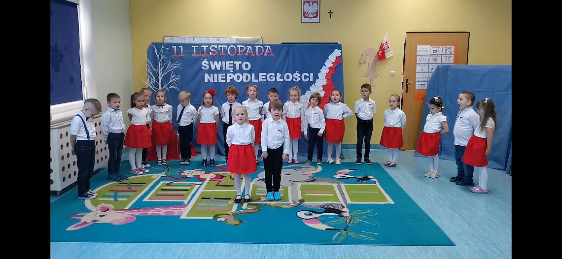 W naszym przedszkolu 10 listopada obchodziliśmy Narodowe Święto Niepodległości. Z tej okazji nasza grupa przygotowała dla wszystkich grup krótki występ artystyczny. Wszyscy byli ubrani odświętnie i z dumą odśpiewali hymn Polski ,, Mazurek Dąbrowskiego".